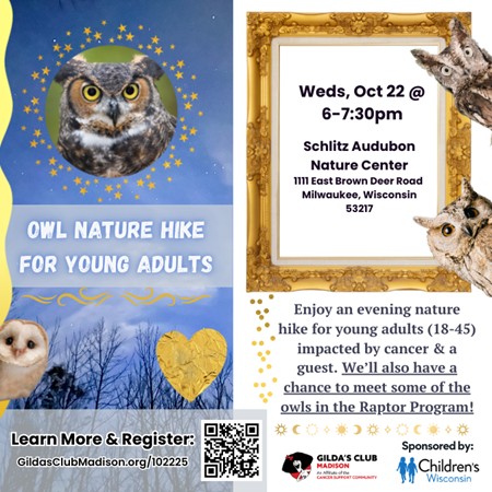 Enjoy an evening nature hike for young adults impacted by cancer (and a guest). We’ll explore the forest to discover “hooo’s” making noises in the night. Sound is the best way to identify owls, so put on your owl ears and prepare to hear and see some