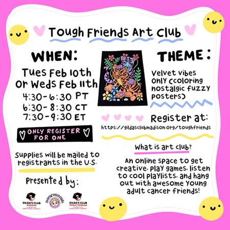 An interactive online workshop where you'll learn about an artist and their creative process, create your own art, and meet some awesome young adult cancer friends. Plus there will be opportunities to win prizes!